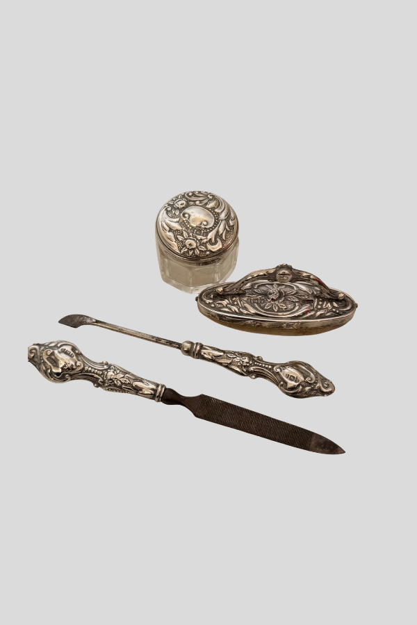 A beautiful antique sterling silver manicure set, showcasing classic craftsmanship and timeless elegance. This set includes traditional grooming tools housed in a compact case, making it both a practical item and a lovely collectible piece.